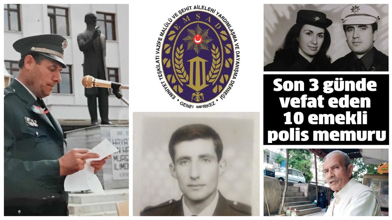 Emniyet Teşkilatı Vazife Malülü ve Şehit Aileleri Yardımlaşma ve Dayanışma Derneği, Türkiye’nin dört bir yanında vefat eden emekli polis memurlarını takip ediyor ve sosyal mecrasında duyurarak başsağlığı diliyor. Derneğin sosyal mecrasını takip ettiğimizde son 3 günde vefat eden 10 emekli polis memuru olduğu görülüyor.
