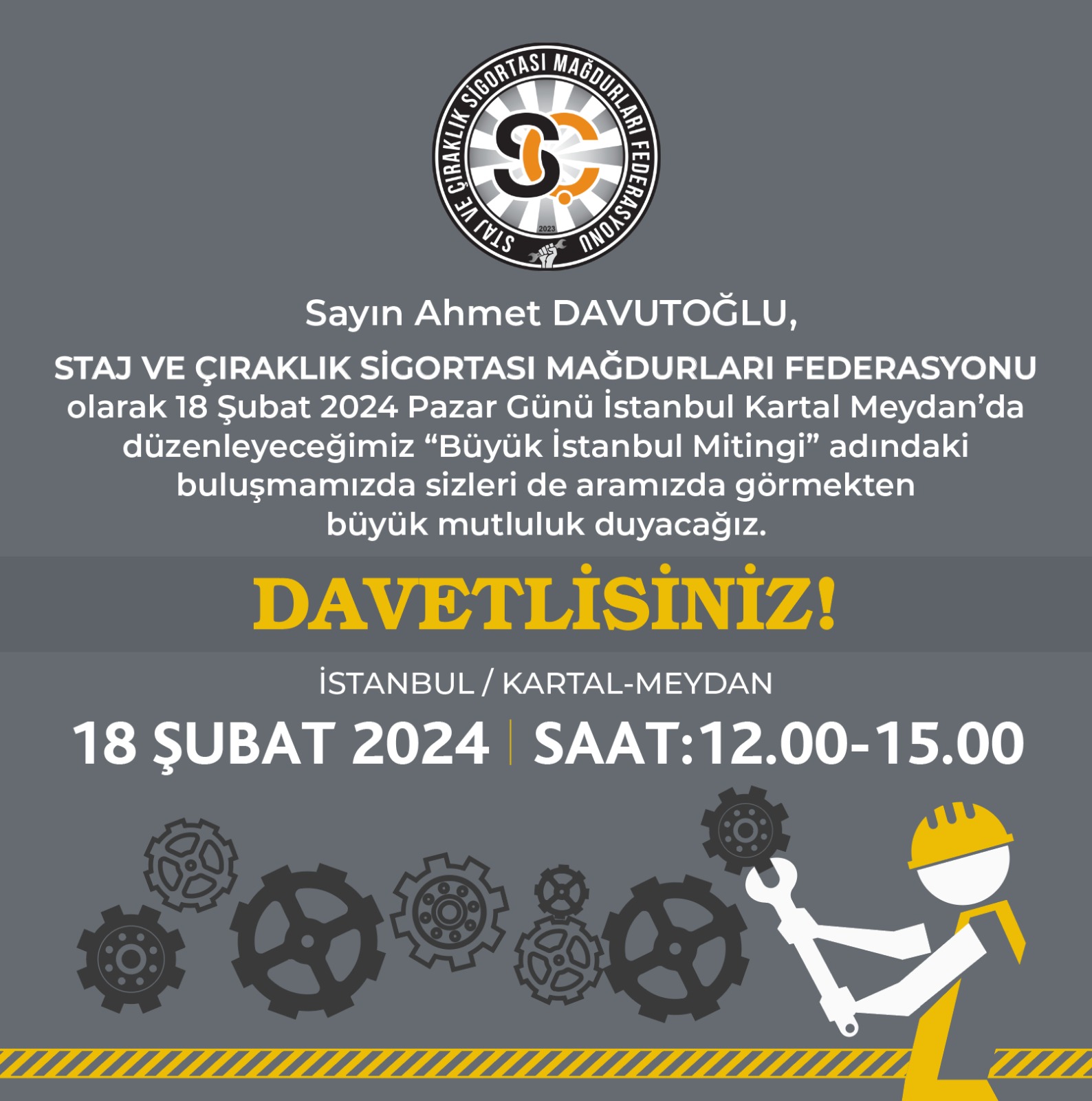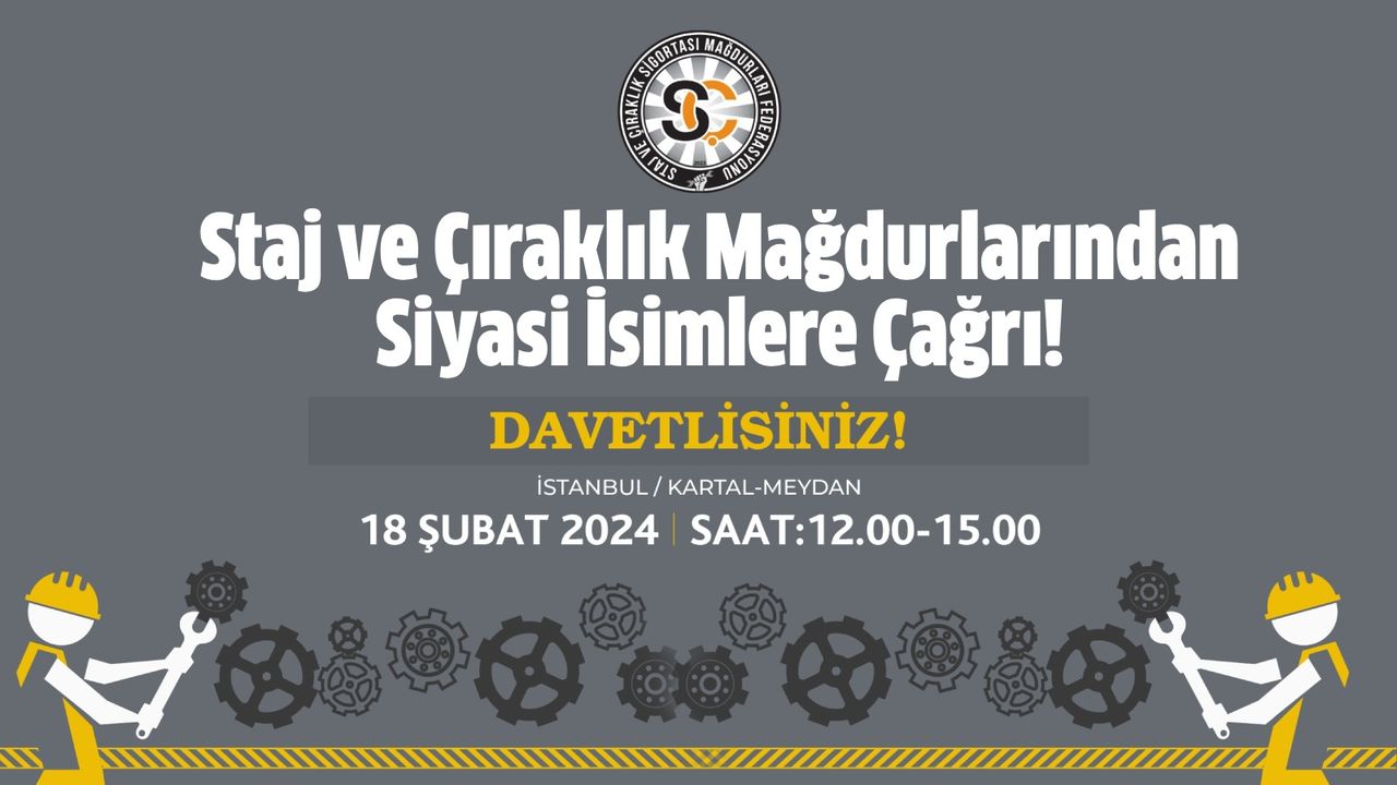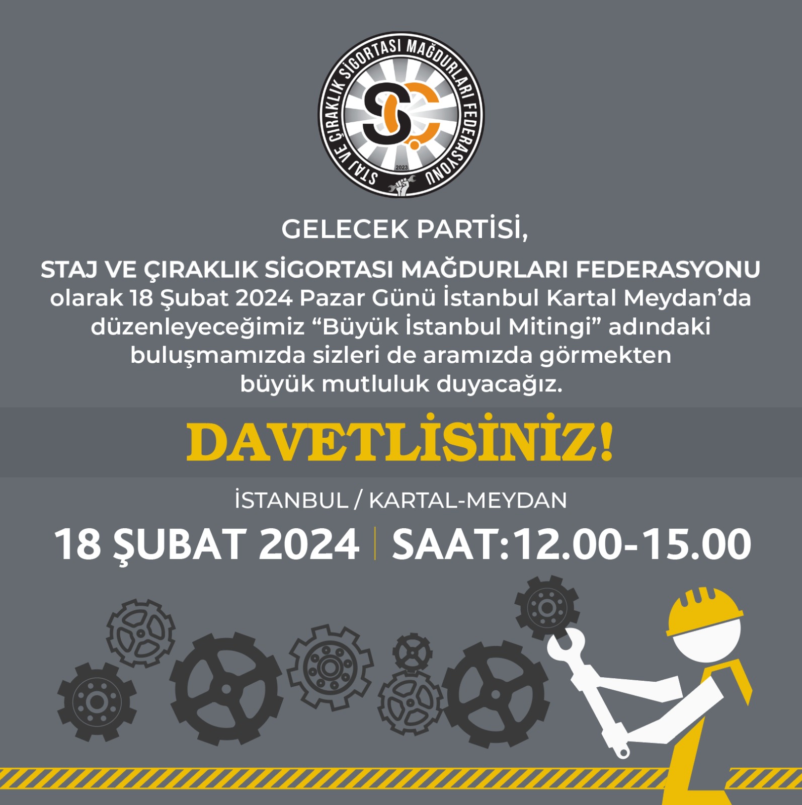 Staj ve Çıraklık Sigortası Mağdurları Federasyonu organizasyonu ile 18 Şubat 2024 Pazar günü saat 12.00 ile 15.00 arasında İstanbul'da miting yapılacak. Federasyon ve dernek yetkilileri ülkenin siyasi partilerinin genel başkanlarını çözümün bir parçası olmaya davet etti. Federasyon sosyal medya hesapları üzerinden yaptığı paylaşımlarla siyasi şahıslara ve partilere özel davetiye sundu. İşte o davetiyeler...