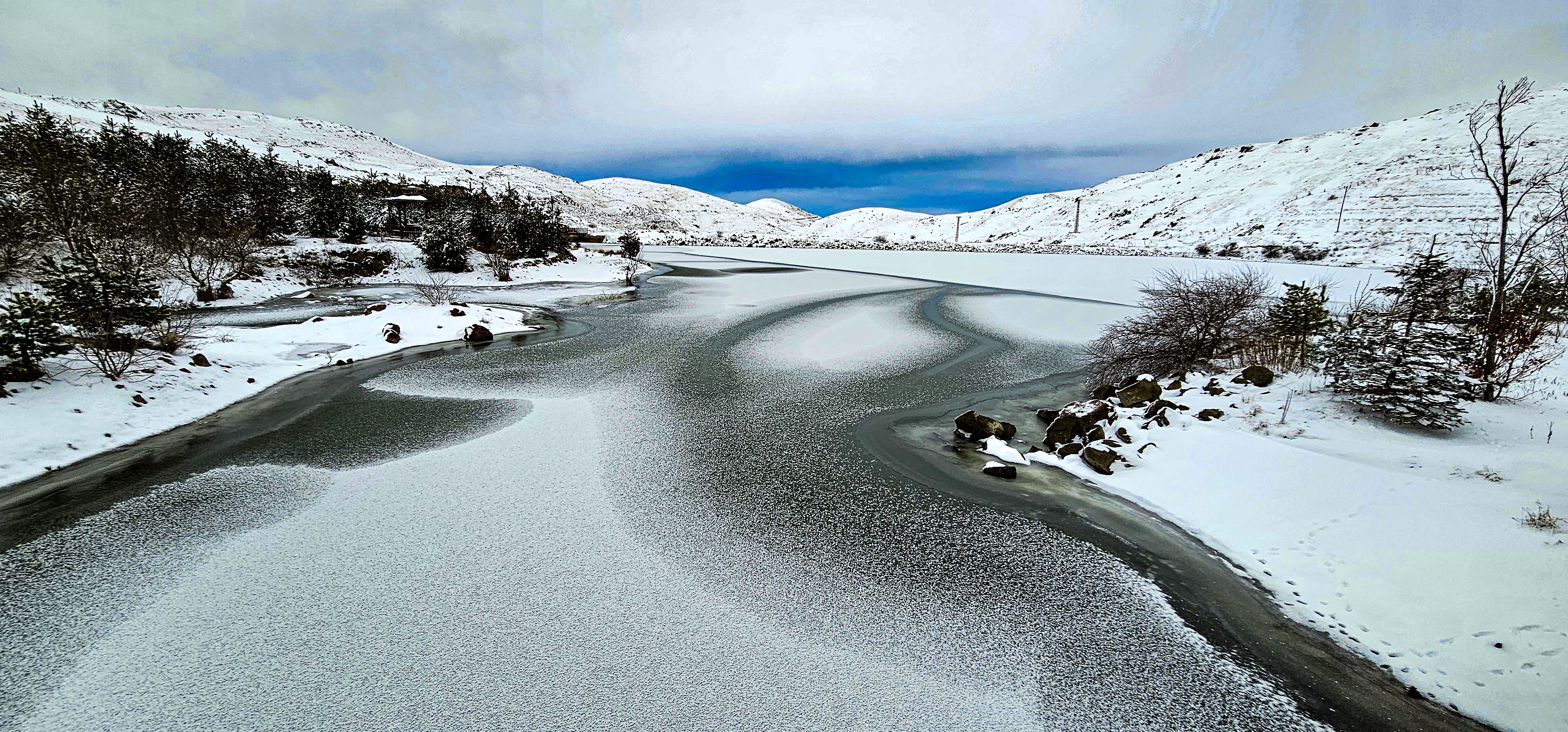 Bölgede yaşanan düşük sıcaklıklar, göletin yüzeyini beyaza bürüdü ve kıyısındaki ağaçlarla birlikte doğaya