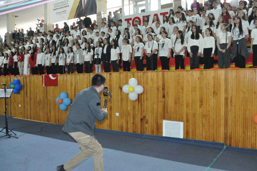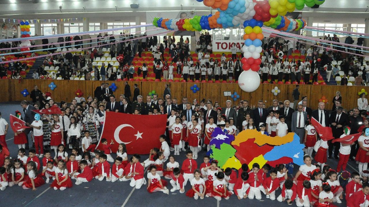 Saygı duruşu ve İstiklal Marşının okunmasının ardından Tokat İl Milli Eğitim Müdürü Hüseyin Kır açılış konuşması yaptı. Müdür Kır konuşmasında, “Bugün, milletimizin bağımsızlık yolundaki en önemli adımlarından biri olan Türkiye Büyük Millet Meclisi'nin açılışının 105. yıl dönümünü ve Gazi Mustafa Kemal Atatürk'ün dünya çocuklarına armağan ettiği 23 Nisan Ulusal Egemenlik ve Çocuk Bayramı’nı coşku ve gurur içinde kutluyoruz. 23 Nisan, sadece millet iradesinin temsili değil, aynı zamanda yarının büyükleri olan çocuklarımıza duyulan güvenin de en güçlü ifadesidir. Atatürk’ün bu anlamlı günü çocuklara ithaf etmesi, onların ülkemizin geleceğinde üstlenecekleri rolün ne denli önemli olduğunun bir göstergesidir. Sevgili çocuklar, sizler bizim en kıymetli hazinemiz, yarınlarımızın teminatısınız. Geleceğimizin aydınlık, ülkemizin güçlü ve huzurlu olması sizlerin alacağı eğitimle, sahip olacağınız değerlerle mümkündür. Sizlere düşen görev; Türkiye Yüzyılı Maarif Modeli ışığında bilime, sanata, ahlaka ve insanlığa değer veren bireyler olarak kendinizi en iyi şekilde yetiştirmenizdir. Geçmişin izinden yürürken geleceğin sorumluluğunu omuzlamanızı iyilikte ve adalette yarışmanızı; bilimi rehber, vicdanı pusula edinmenizi diliyoruz. Bilin ki bizler, sizin daha güzel bir geleceğe ulaşmanız için gece gündüz çalışıyor, mutluluğunuz ve başarınız için tüm imkânlarımızı seferber ediyoruz çünkü bu toprakların yarınları sizlerin kalbinde yeşerecek, ayak izlerinizde şekillenecek. 23 Nisan Ulusal Egemenlik ve Çocuk Bayramı, tüm dünya çocuklarına armağan edilmiştir. Bu vesile ile Doğu Türkistan'daki, Filistin'deki mazlum milletlerin çocuklarının da acılarının bir an önce sona ermesini temenni ediyorum. Bu duygu ve düşüncelerle, başta Cumhuriyetimizin kurucusu Gazi Mustafa Kemal Atatürk ve silah arkadaşları olmak üzere, tüm şehitlerimizi rahmet ve minnetle anıyor; aziz milletimizin ve tüm çocuklarımızın 23 Nisan Ulusal Egemenlik ve Çocuk Bayramı’nı en içten dileklerimle kutluyorum.” şeklinde konuştu.
