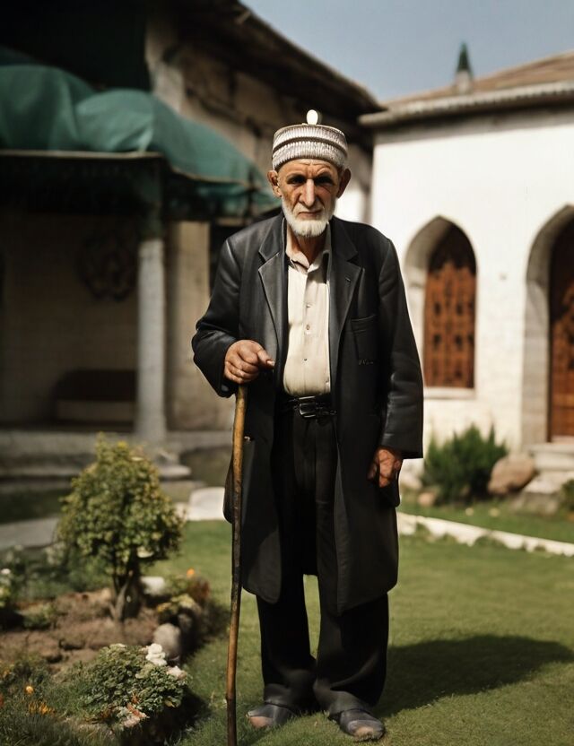 Cami avlusunda namaz vaktini bekleyen Tokatlı emmi.