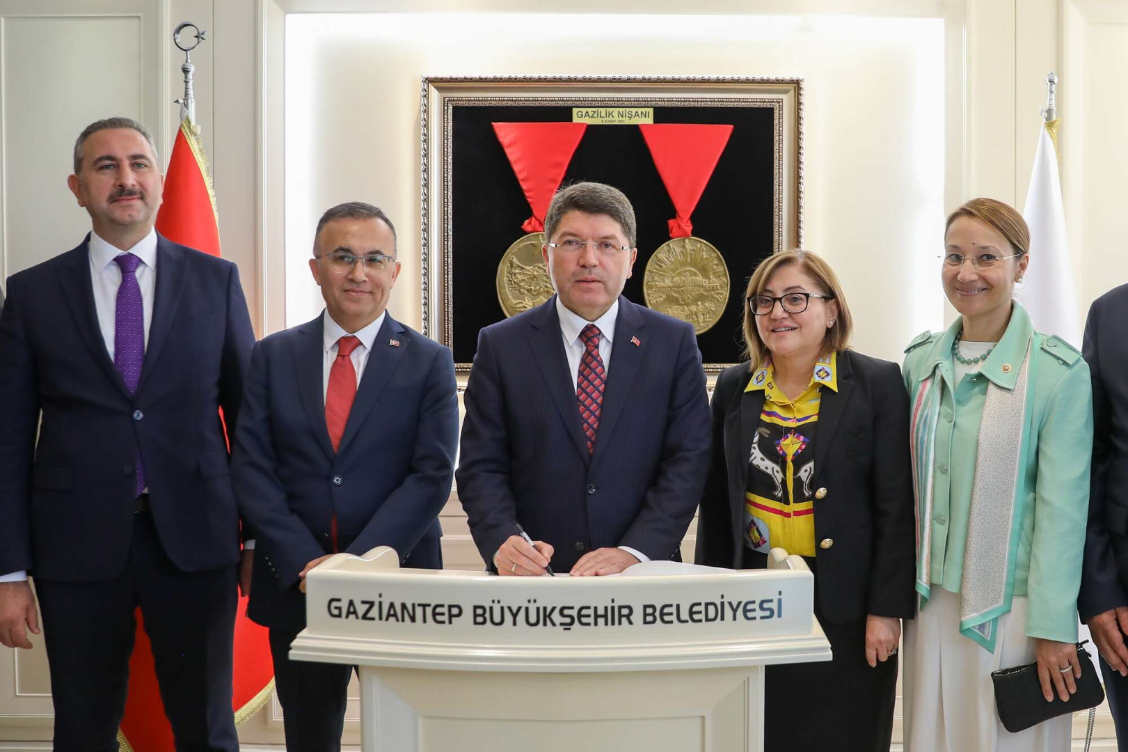 Program sonrası Adalet Bakanı İsmail Tunç, Gaziantep Büyükşehir Belediye Başkanı Fatma Şahin’i makamında ziyaret etti. Şeref defterini imzalayan Bakan Tunç, Başkan Fatma Şahin ile yürütülen çalışmaları ve yeni yapılacak ortak projeler hakkında fikir alışverişinde bulundu.