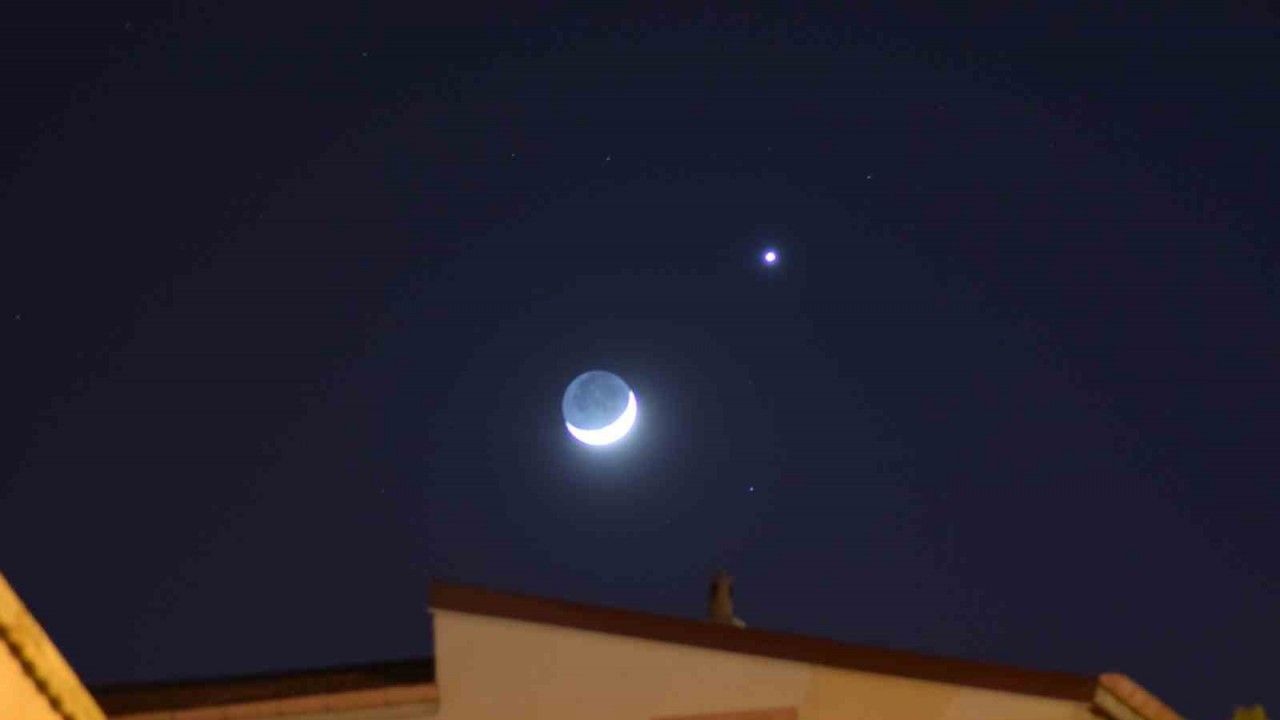Karaman’da gökyüzünde buluşan hilal şeklindeki ay ile yıldız görsel şölen sundu.
