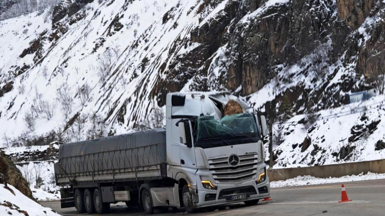 Gümüşhane-Kürtün karayolunda seyir halindeki tırın üzerine dev kaya düştü, olayda sürücü yaralandı.