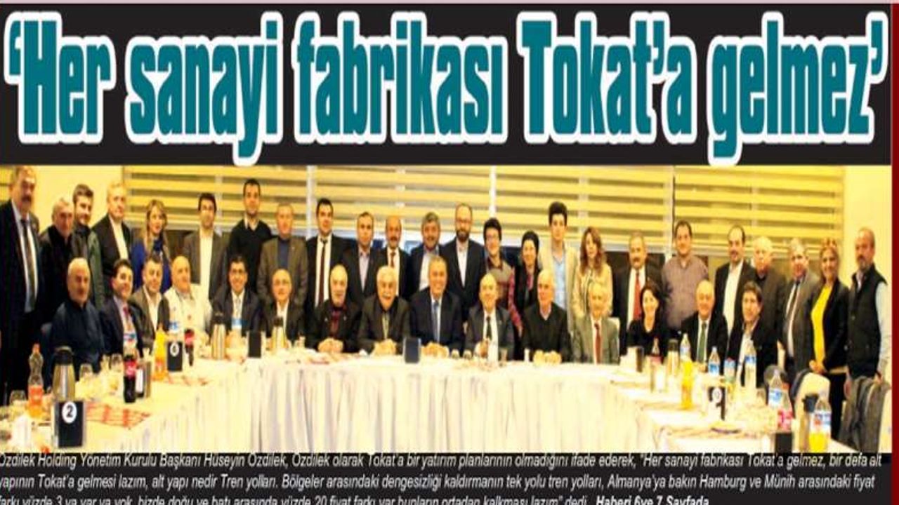 Toplantının ardından Tokat ile ilgili soruları da cevaplayan Özdilek, Biz alışveriş merkezlerinde ilerliyoruz, daha alacağımız çok yol var, Uşak, Turgutlu ve Mudanyada onları açmayı planlıyoruz, bu şekilde bir de Alaatinbey de 1000 kişi istihdam edeceğimiz bir alışveriş merkezi yapacağız, planlı gidiyoruz, kaynakları o yöne yönlendirdiğimiz için çok fazla bir şey yapamayacağız. Tokatta herhangi bir planımız yok. Her sanayi fabrikası Tokata gelmez, bir defa alt yapının Tokata gelmesi lazım, alt yapı nedir Tren yolları, tren yolları sübbansiye edecek, mesela hayvancılık burada gelişebilir ama eti pahalıya taşınıyor. Kiremit fabrikası yükte ağır, pahada hafif, batıda hiç kiremit fabrikası olmaması lazım, buralardan emeğin yoğun olduğu yerler buradan gitmesi lazım, seramik ve diğerleri geliştirilmesi lazım, planlanıp programlanırsa daha başarılı olur. Bölgeler arasındaki dengesizliği kaldırmanın tek yolu tren yolları, Almanyaya bakın Hamburg ve Münih arasındaki fiyat farkı yüzde 3 ya var ya yok, bizde doğu ve batı arasında yüzde 20 fiyat farkı var bunlarıntadan kalkması lazım diye konuştu.
