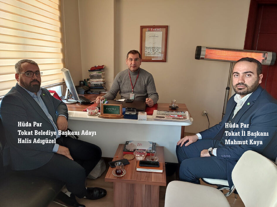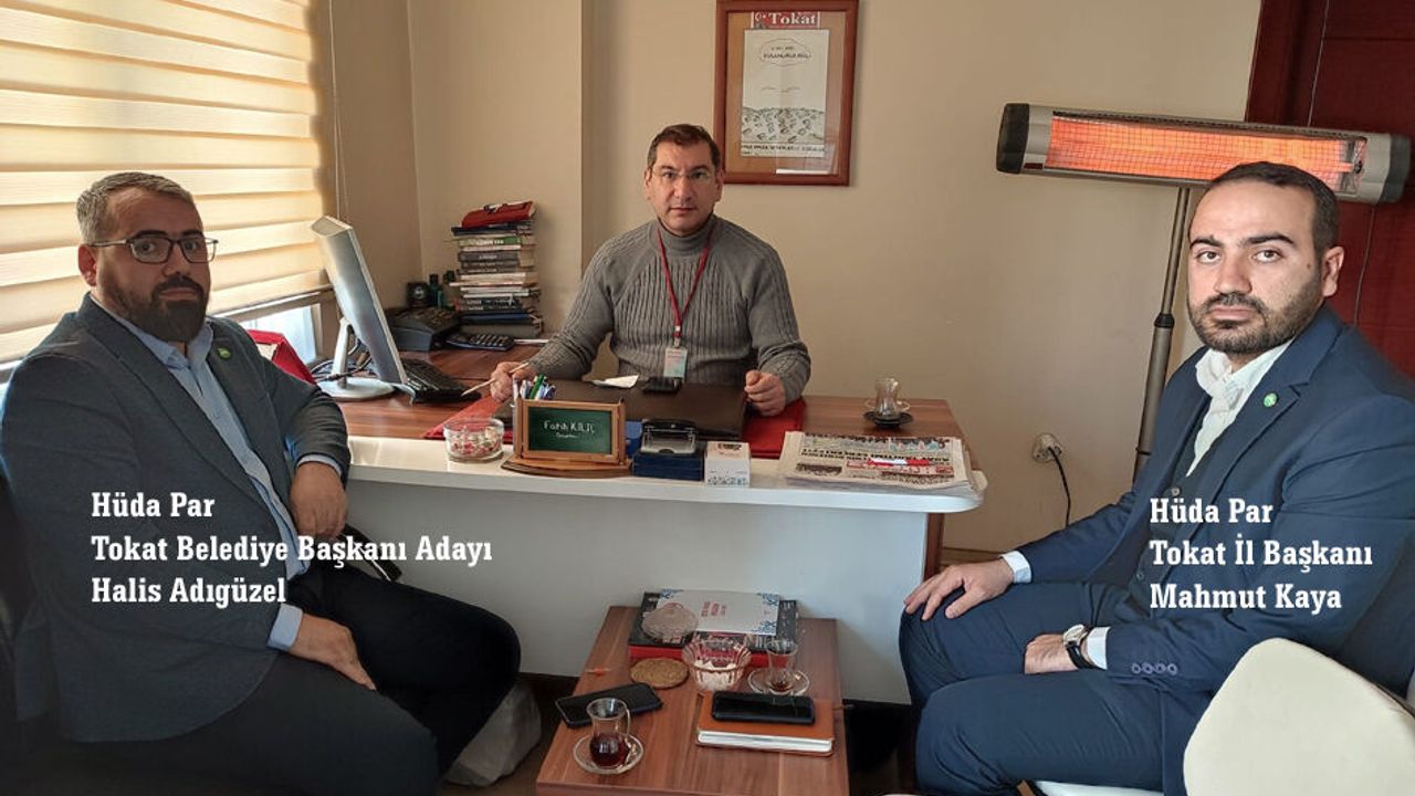 Hüda Par Tokat İl Başkanı Mahmut Kaya, Tokat Hürsöz gazetesi ziyaretinde Sorumlu Yazı İşleri Müdürü gazeteci Fatih Kılıç’a Hüda Par Tokat Belediye Başkanı Adayı’nı tanıttı. Bu isim Halis Adıgüzel’di. Başkan Adayı Halis Adıgüzel ile birlikte ziyarette bulunan İl Başkanı Mahmut Kaya, Tokat İl Genel Meclisi için 1 aday gösterdiklerini onun da adının Zübeyir Dağlı olduğunun bilgisini verdi. Turhal, Zile, Erbaa ve Niksar’da İl Genel Meclisi için aday koyduklarını belirtti.