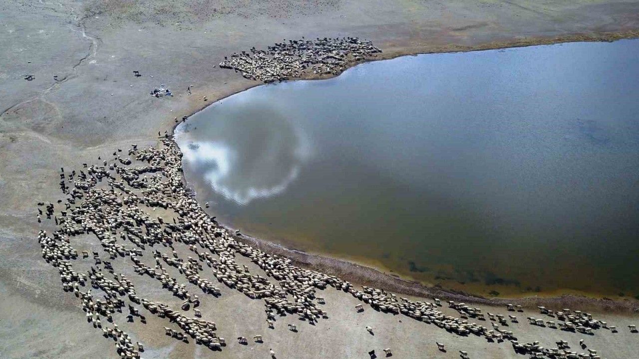 Nemrut Kalderası’nda bulunan irili ufaklı göletlerden biri olan Kalp Gölü’ne su ihtiyaçlarını gidermek için gelen yaklaşık 2 bin küçükbaş hayvan gölle birlikte kartpostallık görüntüler oluşturdu. Göl etrafında adeta bir hilal şeklinde dizilerek su ihtiyaçlarını karşılayan yüzlerce küçükbaş hayvan havadan görüntülendi.