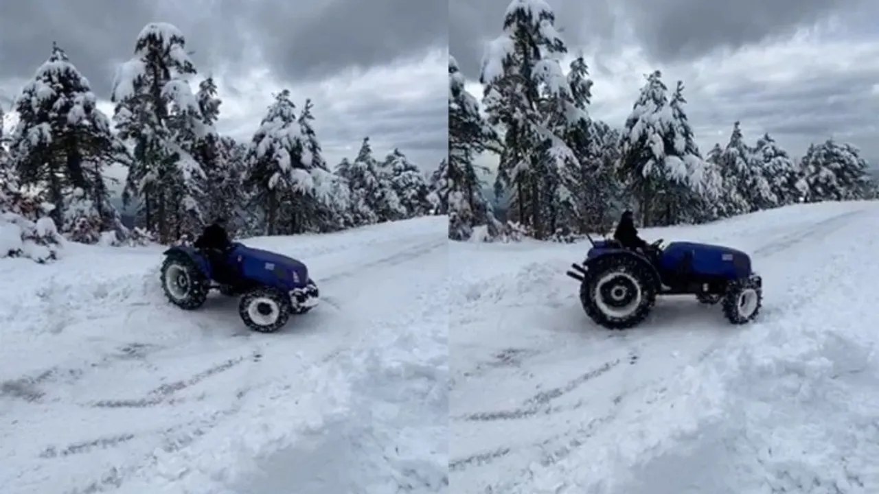 Hatay'ın Erzin ilçesinde yaşayan Çağlar Çardak adlı çiftçi kar yağışı sonrası kullandığı traktörü ile Amanos dağlarında bulunan karlı kaplı Üçkoz yaylasına çıkarak kullandığı traktörü ile beyaza bürünen karlı yolda drift yaptı.