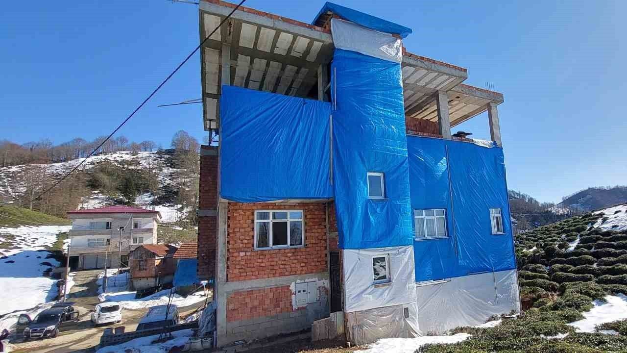 Rize’de bir vatandaş yeni yaptırdığı evinin dışını yağmurdan ve soğuktan korumak için branda ile kaplayarak geçici bir mantolama yaptı.