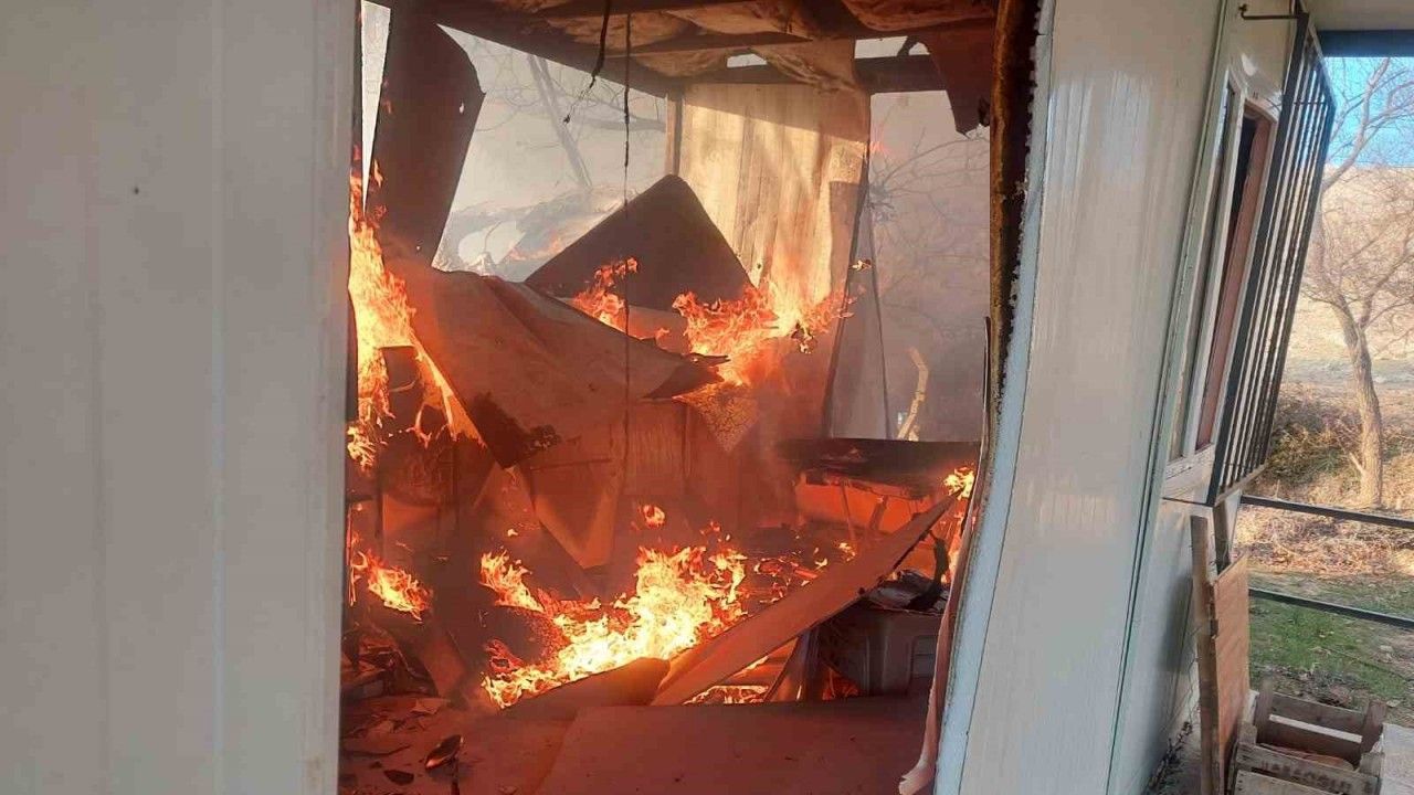 Karaman’da bahçe evinde bulunan konteyner ev, çıkan yangında alevlere teslim oldu.