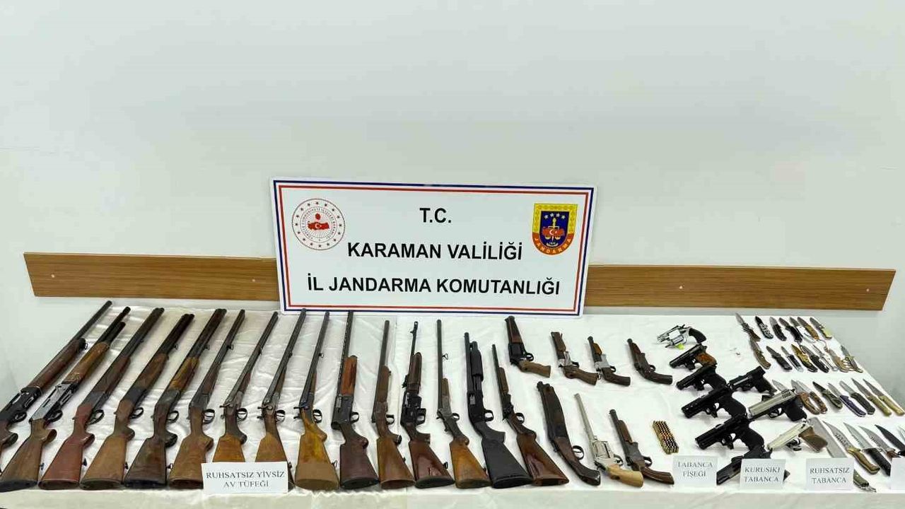 Edinilen bilgiye göre, Ermenek İlçe Jandarma Komutanlığı ve Kazancı Karakol Komutanlığı ekipleri, ilçeye bağlı Kazancı beldesi Çatalbadem mahallesinde A.T. isimli şahsın kaçak silah ticareti yaptığı bilgisine ulaştı. Cumhuriyet Başsavcılığı koordinesinde harekete geçen ekipler, şahsın evinde arama yaptı. Aramalarda 3 ruhsatsız tabanca, 23 ruhsatsız av tüfeği, 6 kurusıkı tabanca, 3 şarjör, 32 bıçak, 87 fişek ve kaçak içki ele geçirildi.