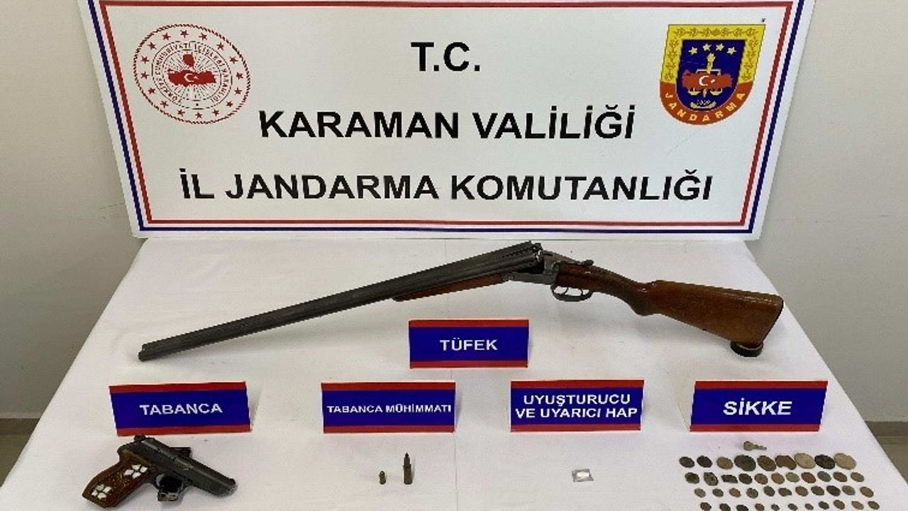 Karaman’da jandarmanın yaptığı uygulamalarda çeşitli suçlardan aranan 7 kişi tutuklanırken, tarihi eser, makaron, uyuşturucu ve ruhsatsız silahlar ele geçirildi.