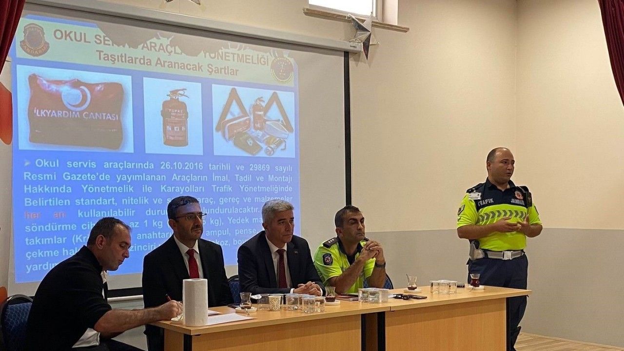Toplantıda, taşımalı eğitim sisteminde görev alan sürücüler ve rehber personellerin görev ve sorumlulukları, uymaları gereken trafik kuralları, öğrenci taşıma güvenliği, araçların bakım ve kontrolleri gibi konularda kapsamlı bilgilendirmeler yapıldı. Ayrıca, yeni eğitim öğretim yılında yaşanabilecek muhtemel sorunların önlenmesi için alınacak tedbirler ve izlenecek yöntemler üzerinde duruldu. İlçe Jandarma Trafik Komutanlığı ve Bölge Trafik Denetleme ekipleri tarafından sürücülere yönelik trafik güvenliği, hız kontrolü, emniyet kemeri kullanımı, okul servis araçlarının taşıma standartları gibi konularda sunumlar yapılarak dikkat edilmesi gereken hususlar aktarıldı.