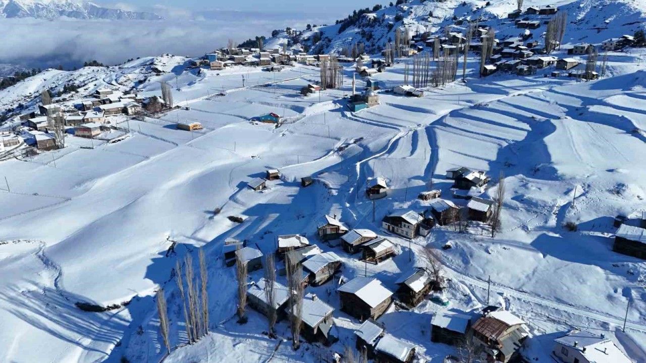 Dron kamerasıyla görüntülenen bu eşsiz manzaralar, doğaseverlerin ve fotoğraf tutkunlarının ilgisini çekiyor. Görüntülerde köyün doğal dokusu, kışın beyaz örtüsüyle birleşerek huzur veren bir atmosfer sunuyor.