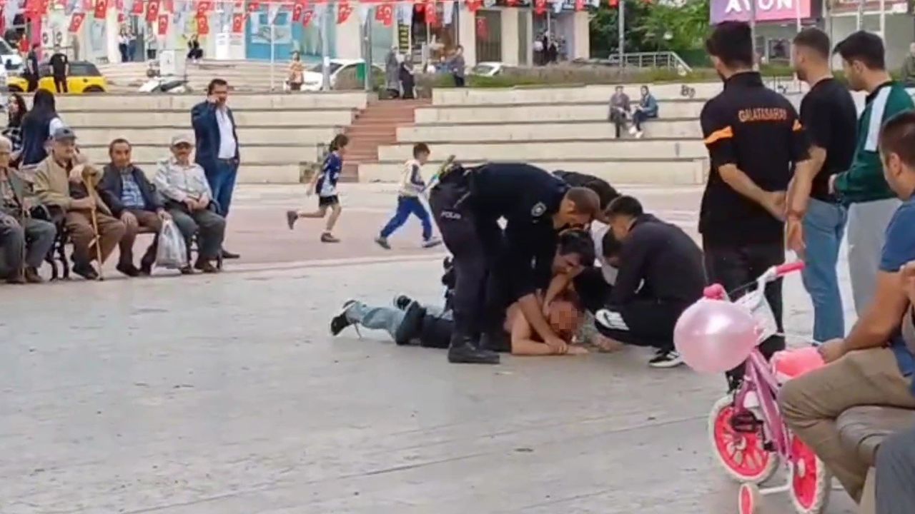 Olay, Misak-ı Milli Meydanında meydana geldi. İki kişi arasında henüz bilinmeyen bir nedenle kavga çıktı. Polis ekiplerinin araya girmesine rağmen karşısındakine saldırmaya çalışan şahıs yediği yumrukla yere yığıldı. Güçlükle kontrol altına alınan şahsın, polis ekiplerine yaşattığı zor anlar cep telefonu kamerası tarafından görüntülendi.