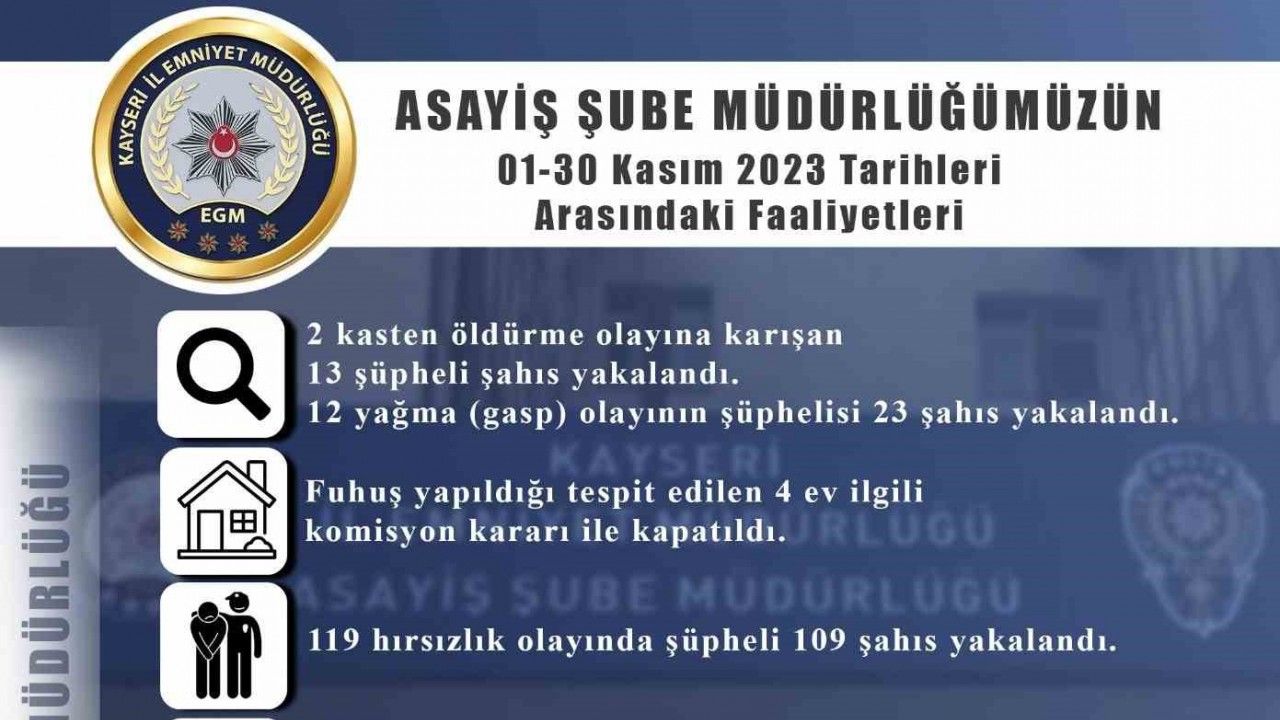 Kayseri İl Emniyet Müdürlüğü Asayiş Şube Müdürlüğü ekipleri tarafından 01-30 Kasım tarihleri arasında yapılan çalışmalarda 119 hırsızlık olayının şüphelisi 109 şahıs yakalanırken, çalıntı olarak aranan 14 oto ve 11 motosiklet de bulundu, olayların hırsızlık şüphelisi 17 şahıs da yakalandı. Yine ekipler tarafından yapılan çalışmalarda fuhuş yapıldığı tespit edilen 4 ev de ilgili komisyon kararı ile kapatıldı.