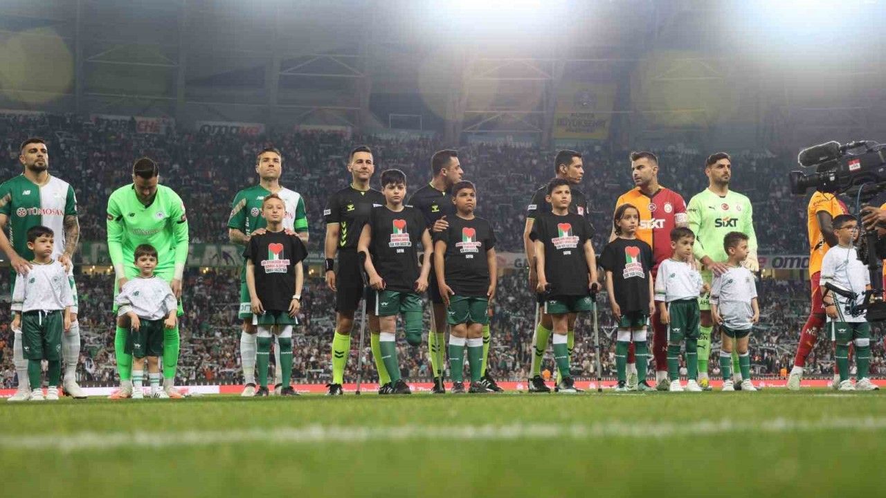 Konyaspor - Galatasaray mücadelesi öncesi yapılan seremonide anlamlı organizasyona imza atıldı. Filistin’e destek için Gazzeli çocuklar futbolcularla birlikte seremoniye çıktı. Çocukların giydikleri tişörtlerde Gazze için mesajlar yazıldığı görüldü. Yeşil-beyazlı futbolcular ısınmaya ise, "Gazze’de ekmek yok, su yok, hayat yok!" pankartıyla çıktı.
