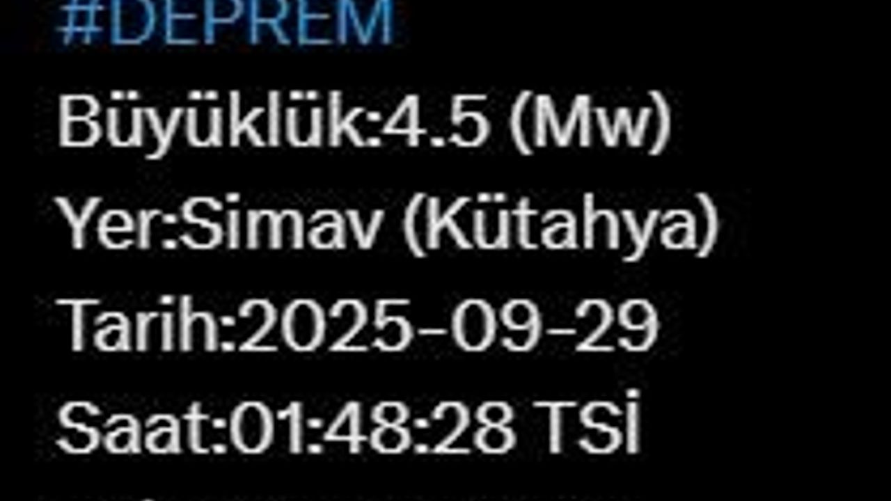 AFAD’ın paylaştığı bilgilere göre, Kütahya’nın Simav ilçesinde saat 01.54’te 4.5 büyüklüğünde deprem meydana geldi. Merkezi Simav ilçesi olan depremin derinliği 10.31 kilometre olarak ölçüldü.