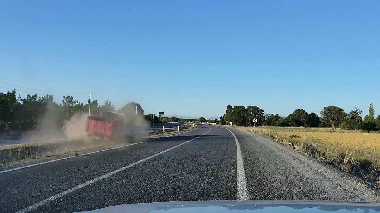 Edinilen bilgiye göre olay, Beyşehir-Antalya Kara yolu üzerindeki bölünmüş yolda, Beyşehir ilçe merkezi yönüne seyir halinde olan ve kendi şeridinde ilerleyen bir kamyonun şehir merkezine yaklaşılırken aniden lastiği patladı. Lastikten kopan parçaların yola savrulurken, kontrolden çıkan ve karşı şeride doğru yön değiştiren kamyon, bir anda refüjdeki çukura girerek sağa sola yalpalamaya başladı. Kamyon sürücüsü aracını trafik levhalarına da çarpmadan devirip yatırmamak için büyük uğraş verirken, aracın refüjde kalmasını sağlayarak, karşı şeritten geçen araçlarla çarpışmasının da önüne geçip durdurmayı başardı. Kara yolunda yüreklerin ağızlara geldiği anlar, kamyonun arkasında seyir halinde olan bir otomobilin araç kamerası tarafından saniye saniye kaydedildi.