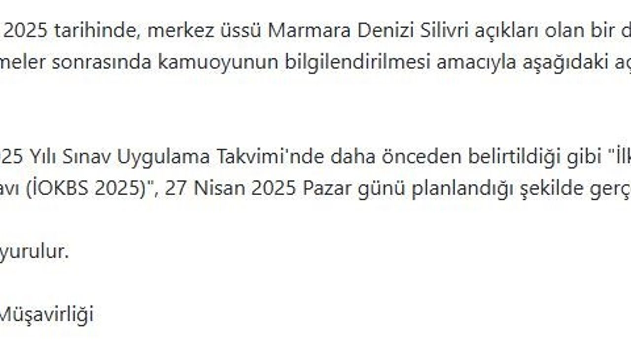 23 Nisan’da merkez üssü Marmara Denizi Silivri açıkları olan bir deprem meydana gelmişti. Yaşanan gelişmeler sonrasında kamuoyunun bilgilendirilmesi amacıyla MEB tarafından bir açıklama yapıldı. MEB’in açıklamasında, İOKBS 2025 sınavının ertelenmeyeceği ve belirlenen tarih olan 27 Nisan’da gerçekleşeceği ifade edildi.