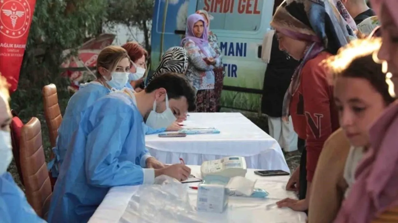 Tekkeköy’ün Balcalı Mahallesi’nde kurulan sağlık çadırında teste giren işçilerin sağlık kontrolleri uzmanlar tarafından yapılıyor. İşçilerin kaldıkları mekanlara gidilerek kanser tarama aracının içerisinde meme kanseri taraması uygulanırken, kurulan çadırda işçilerin insülin değerlerine, boy ve kilo endeksine, tansiyonlarına ve solunum durumlarına bakılıyor.