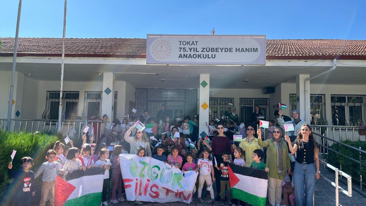 Tokat’ta 75. Yıl Zübeyde Hanım Anaokulu öğrencileri, Filistin’de yaşanan insanlık dramına dikkat çekmek ve farkındalık oluşturmak amacıyla anlamlı bir etkinlik düzenledi.
