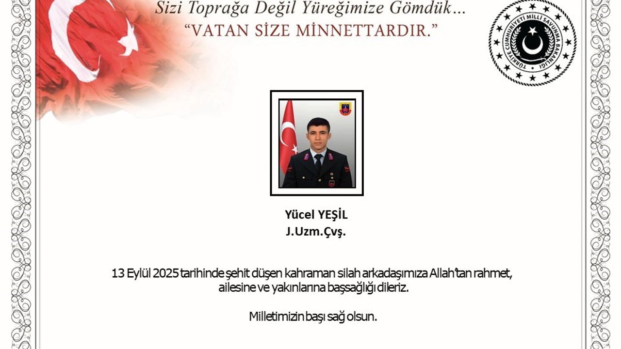 MSB tarafından Kütahya’da, yol kontrol devriyesi esnasında bir otomobilin çarpması sonucu şehit olan Jandarma Uzman Çavuş Yücel Şehit için başsağlığı mesajı yayımlandı. Mesajda, "13 Eylül 2025 tarihinde şehit düşen kahraman silah arkadaşımıza Allah’tan rahmet, ailesine ve yakınlarına başsağlığı dileriz. Milletimizin başı sağ olsun" ifadelerine yer verildi.