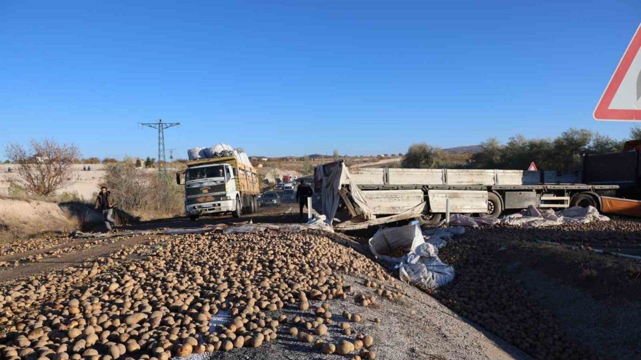 Nevşehir’de patates yüklü bir tırın devrilmesi sonucu tonlarca patates karayoluna döküldü. Kaza nedeniyle yol bir süre çift yönlü trafiğe kapandı.