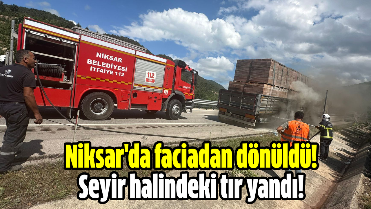Tokat'ın Niksar ilçesinden Reşadiye'ye giden Y.E. yönetimindeki 60 ZA282 plakalı tır balataların ısınması nedeniyle alev aldı.