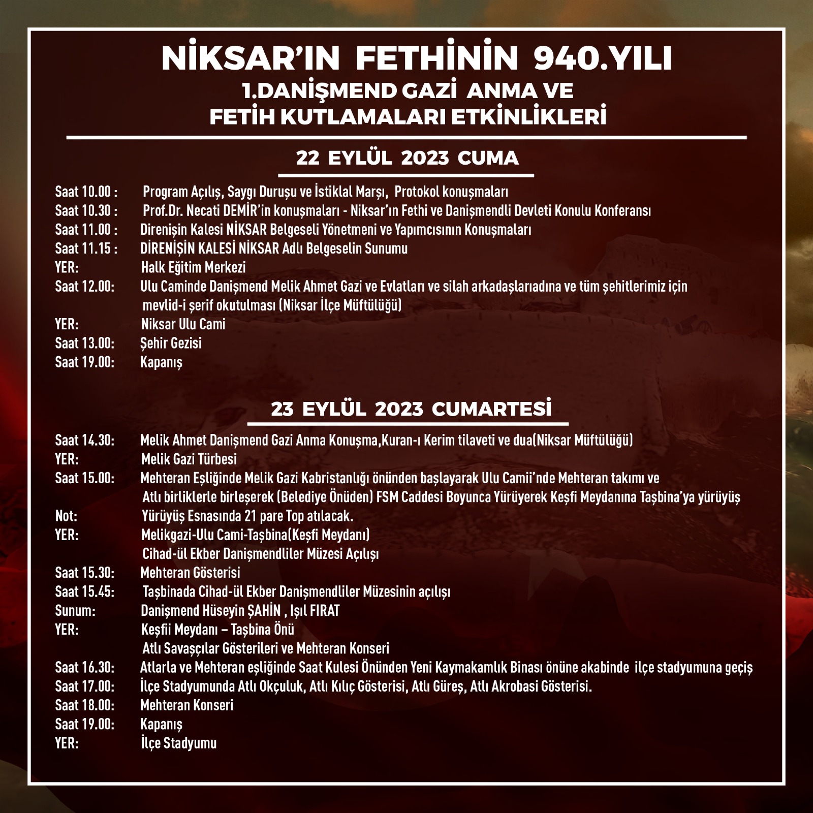 Tokat’ın Niksar ilçesinin fethinin 940. Yılı kutlanıyor. 22 Eylül Cuma günü (bugün) saat 10.00’da başlayan kutlama etkinlikleri 23 Eylül Cumartesi günü gün boyu yapılacak etkinlikle son bulacak. Etkinliklerde atlı gösterilen öne çıkacak.
