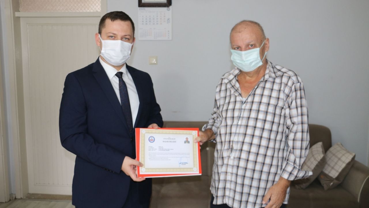 Demirer, sağlığına kavuşarak görevinin başına dönmesini temenni ettiği Ak'a başarı belgesi de sundu.