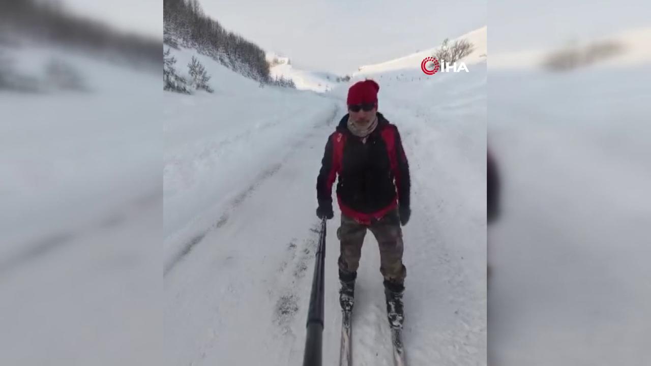 Kış sporlarına olan tutkularıyla tanınan iki arkadaş, bu yıl bütçe ve imkanlar el vermeyince kayak takımlarını kuşanıp ilçenin karlı yollarına çıktı. Araç trafiğinin az olduğu, karla kaplı köy yolunu profesyonel bir piste dönüştüren doğaseverler, dakikalarca kayarak karın tadını çıkardı.