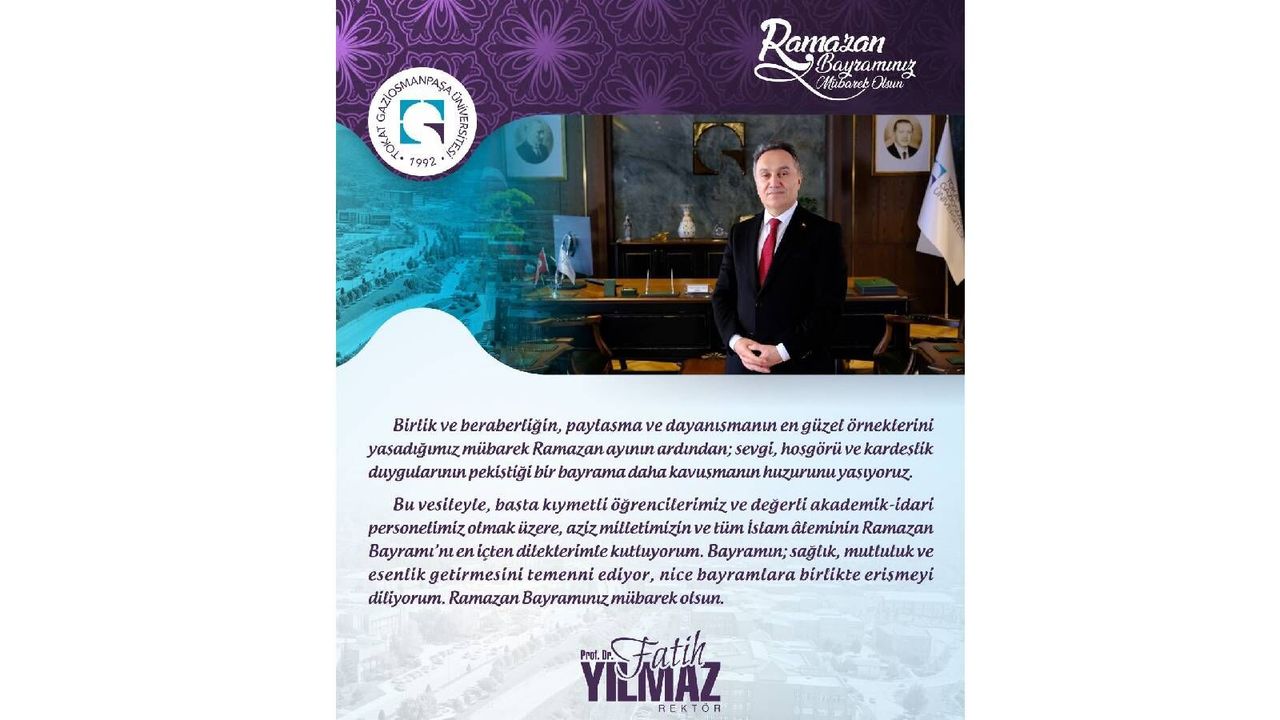 Ramazan ayının birlik, beraberlik, paylaşma ve dayanışmanın en güzel örneklerine sahne olduğunu vurgulayan Yılmaz mesajında, “"Birlik ve beraberliğin, paylaşma ve dayanışmanın en güzel örneklerini yaşadığımız mübarek Ramazan ayının ardından; sevgi, hoşgörü ve kardeşlik duygularının pekiştiği bir bayrama daha kavuşmanın huzurunu yaşıyoruz. Bu vesileyle, başta kıymetli öğrencilerimiz ve değerli akademik-idari personelimiz olmak üzere, aziz milletimizin ve tüm İslam âleminin Ramazan Bayramı’nı en içten dileklerimle kutluyorum. Bayramın; sağlık, mutluluk ve esenlik getirmesini temenni ediyor, nice bayramlara birlikte erişmeyi diliyorum. Ramazan Bayramınız mübarek olsun." Dedi.