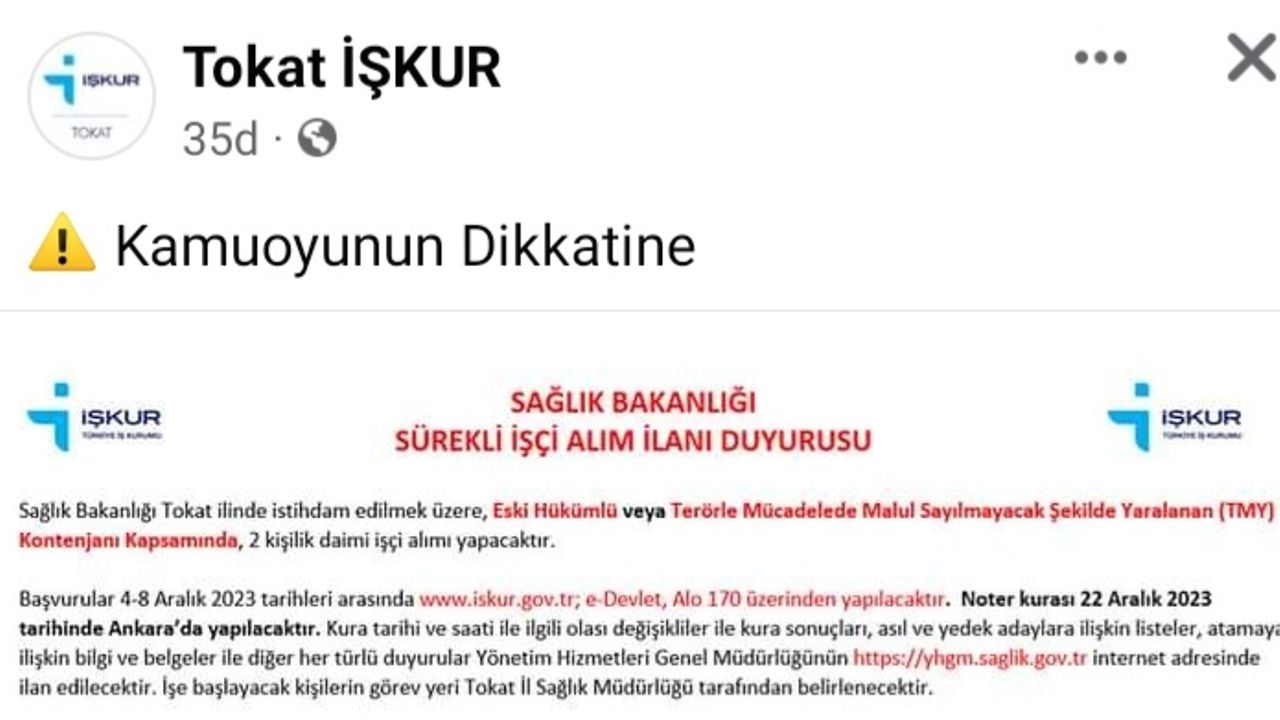 Sağlık Bakanlığı Tokat ilinde istihdam edilmek üzere eski hükümlü veya terörle mücadelede malul sayılmayacak şekilde yaralanan (TMY) kontenjan kapsamında 2 kişilik daimi işçi alınacağını duyurdu.