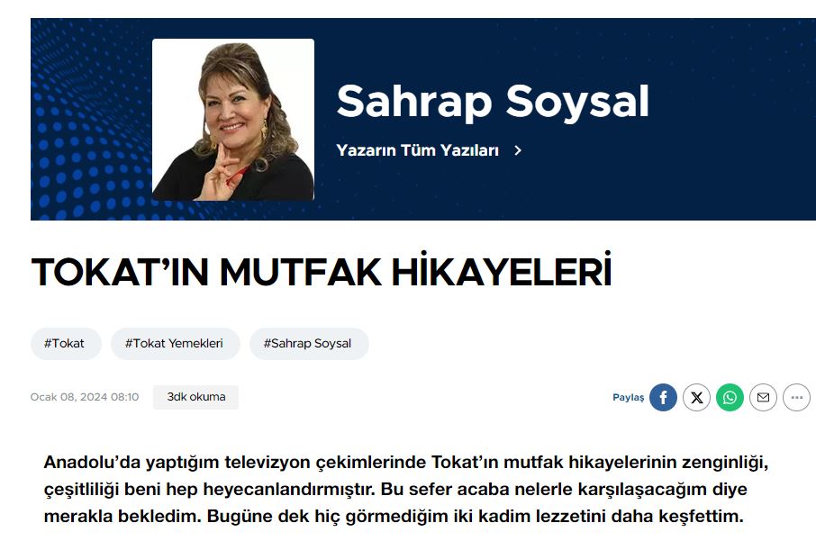 Sahrap Soysal'ın Tokat'ı ve Tokat mutfağını anlattığı yazısı şöyle oldu;