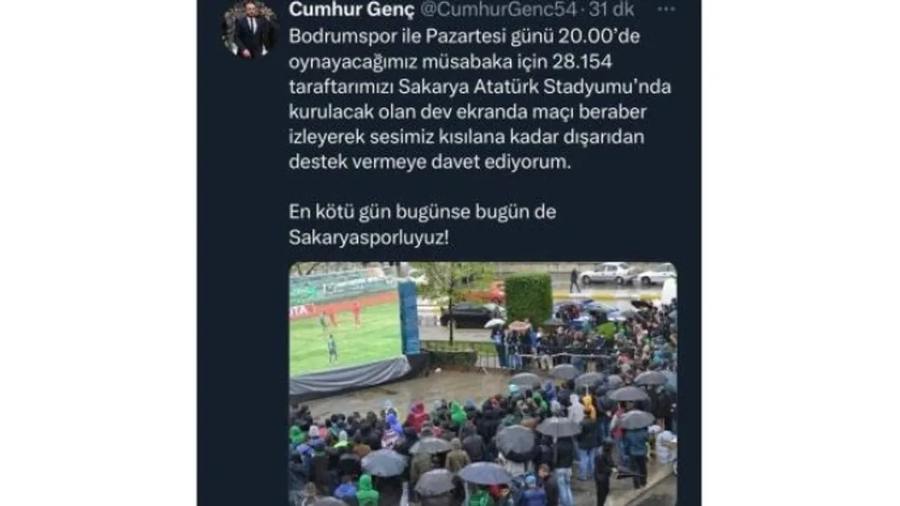 Spor Toto 1. Lig'in 25. haftasında oynanan ve hem saha içi hem de tribünlerde çeşitli olayların yaşandığı Sakaryaspor - Yılport Samsunspor karşılaşması sonrasında Sakaryaspor'a ‘2 resmi müsabakayı kendi sahasında seyircisiz oynama cezası' verilmişti. Sakaryaspor Kulüp Başkanı Cumhur Genç, ligin 27. haftasında karşılaşacakları ve aldığı seyirci cezası sebebi ile yeşil-siyahlı taraftarların alınmayacağı Bodrumspor maçı için Sakarya Atatürk Stadyumu'nda dev ekran kurulacağını açıkladı. Kulüp Başkanı Cumhur Genç sosyal medya hesabı üzerinden yaptığı paylaşımda, “Bodrumspor ile Pazartesi günü 20.00'de oynayacağımız müsabaka için 28 bin 154 taraftarımızı Sakarya Atatürk Stadyumu'nda kurulacak olan dev ekranda maçı beraber izleyerek sesimiz kısılana kadar dışarıdan destek vermeye davet ediyorum. En kötü gün bugünse bugün de Sakaryasporluyuz” ifadelerine yer verdi.