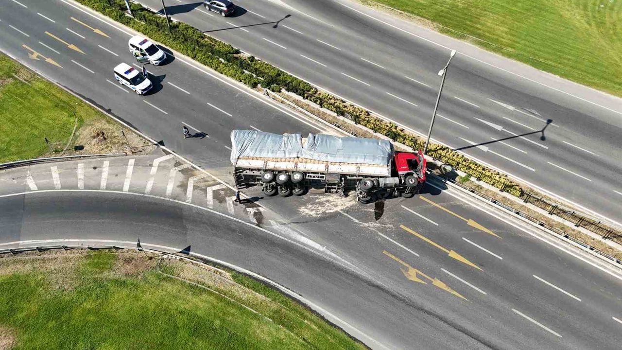 100 kara yolu Kervan Kavşağı mevkisinde saman yüklü tır aracı devrildi. Kaza sonrası tırdan çıkan sürücü önce mazot hortumlarını kontrol etti, ardından ise ’hızlıydım’ dedi.