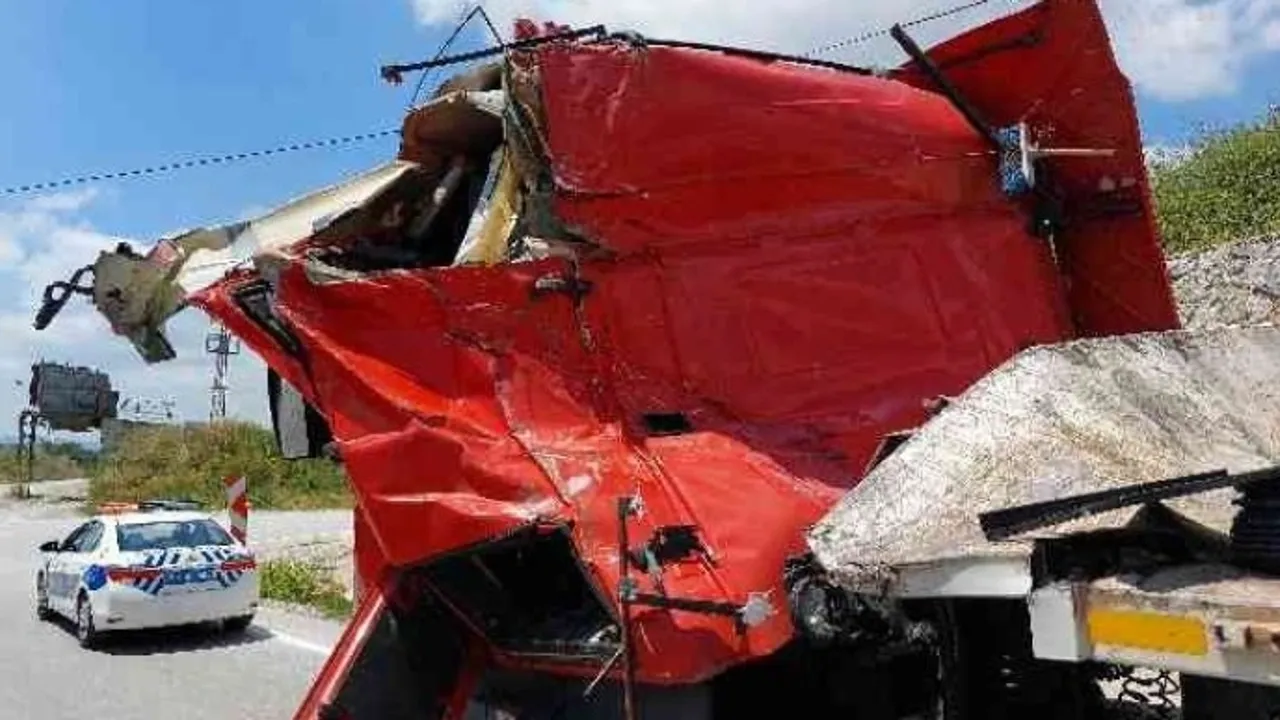 Samsun'da yoldan çıkarak demir yüklü bir başka tırın üzerinden geçen tır, su kanalına düştü. İnanılmaz kazada sürücü yaralandı.