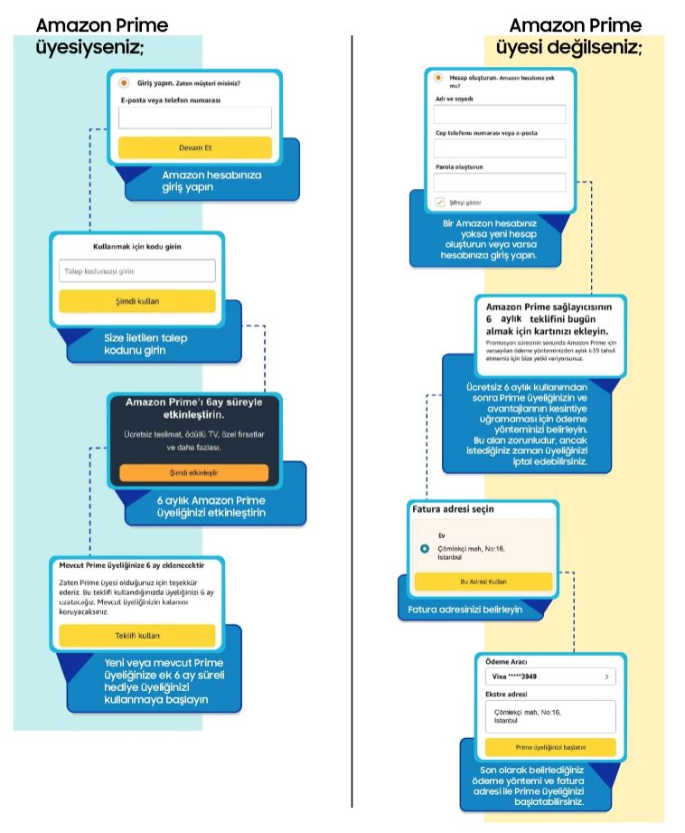 Samsung Türkiye, müşteri sınırlaması olmayan bir kampanya başlattı ve Amazon ile yapılan ortaklık kapsamında isteyen herkese 6 aylık ücretsiz Amazon Prime aboneliği hediye ediyor. Kampanya, Samsung tarafından açılan bir web sitesi üzerinden katılımcılara promosyon kodu verilerek gerçekleştiriliyor.