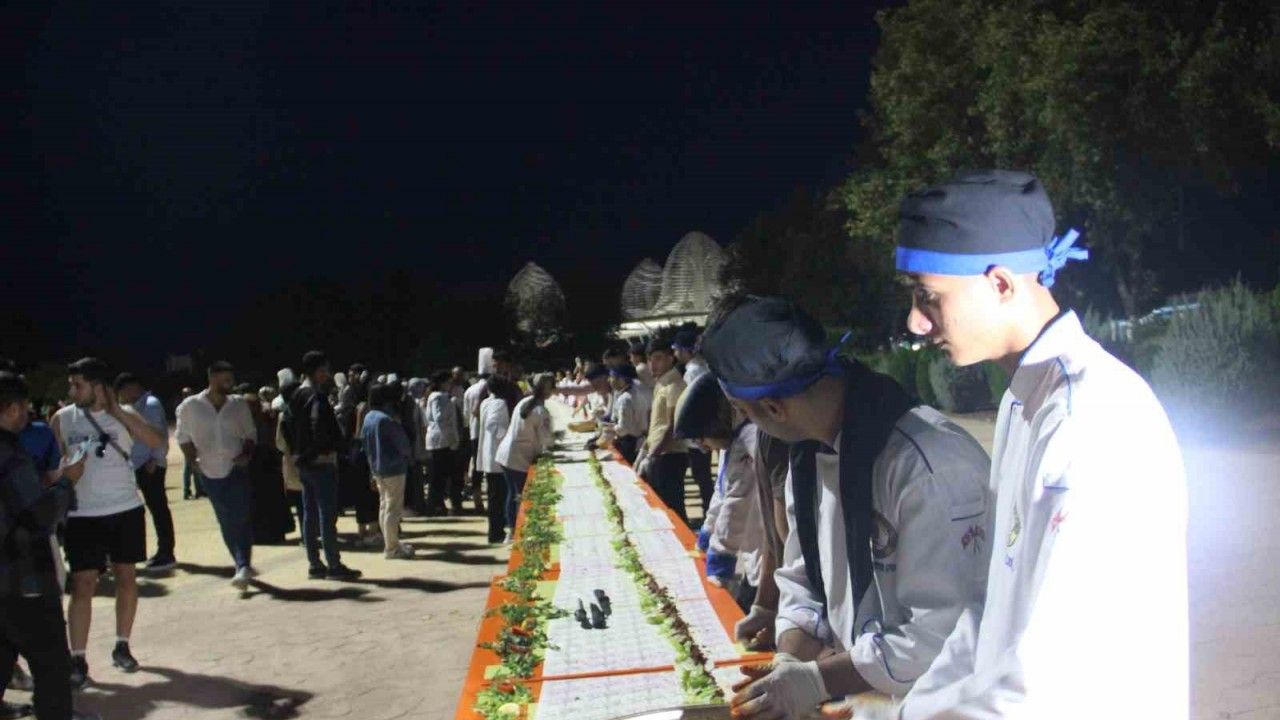 Harran Üniversitesinin öğrencilerin yeni dönemde okula uyum sağlamaları için düzenlediği etkinlikte yöreye özgü lezzetlerden çiğköfte yoğurularak 63 metrelik dürüm yapıldı. Hazırlanan 63 metrelik çiğköfte dürüm öğrenciler tarafından dakikalar içerisinde tüketildi.