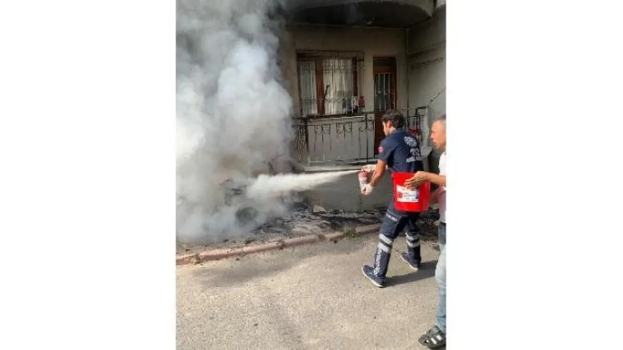 Sivas'ta şarj edildiği sırada yanan engelli motosikletine ilk müdahaleyi mahalle sakinleri ile 112 sağlık çalışanları yaptı.