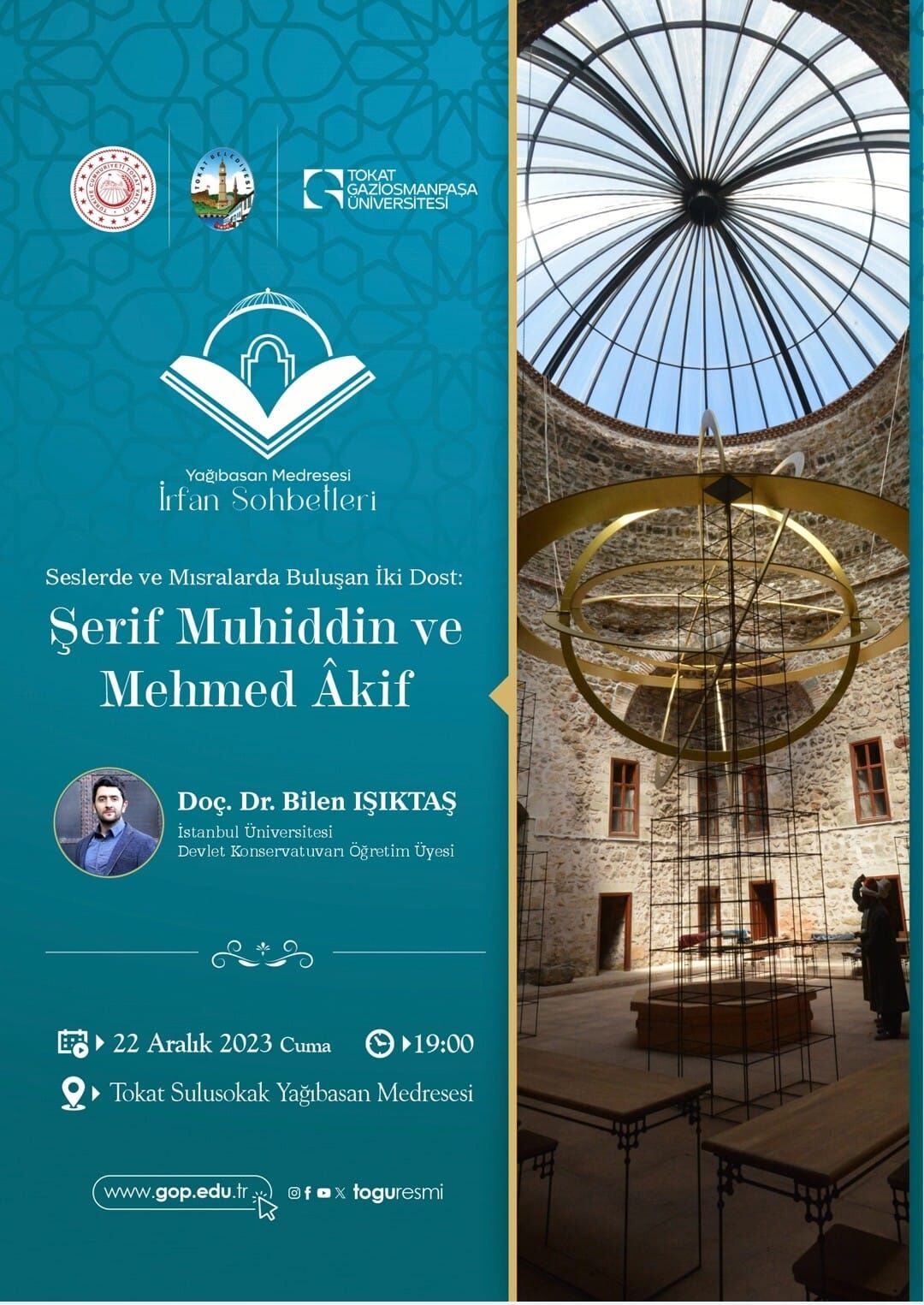İstanbul Üniversitesi Devlet Konservatuvarı Öğretim Üyesi Doç. Dr. Bilen Işıktaş, Tokat Yağıbasan Medresesi İrfan Sohbetleri için Tokat’a gelecek. Peygamber’in Dahi Torunu Şerif Muhiddin Targan ile İstiklal Şairimiz Mehmet Akif Ersoy’u Seslerde ve Mısralarda Buluşan İki Dost olarak anlatmak üzere Tokat’taki İrfan Sohbetlerinin konuşmacısı olan Doç. Dr. Bilen Işıktaş’ın Şerif Muhiddin Targan için yazılmış kitabı bulunuyor.