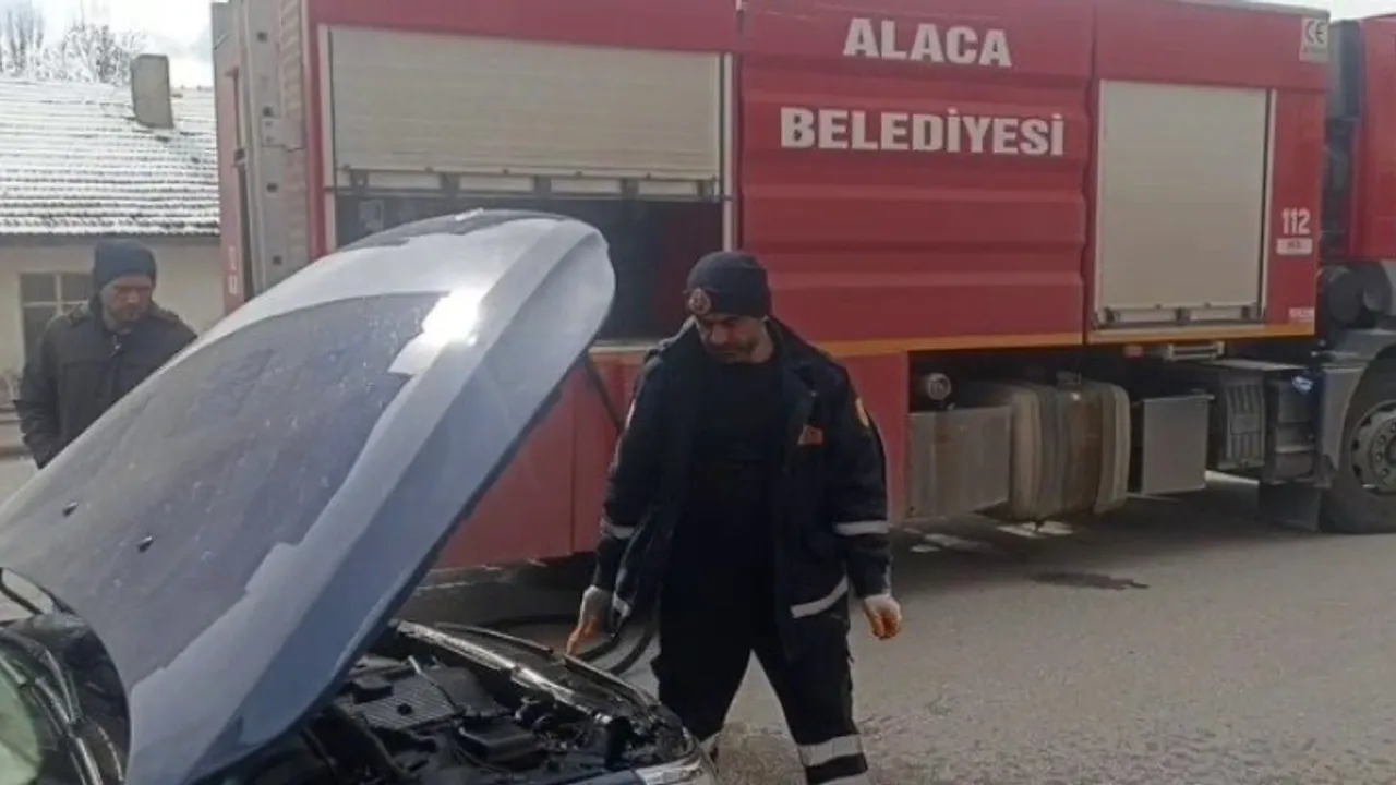 Olay, Alaca ilçesi Çorum Caddesi'nde meydana geldi. Edinilen bilgiye göre, seyir halinde olan Alperen K. yönetimindeki 19 HA1091 plakalı otomobilin motor kısmın alev aldı. Araçtan dumanlar yükseldiğini gören sürücü itfaiyeyi arayarak yardım istedi. İhbar üzerine olay yerine gelen itfaiye ekipleri yangını büyümeden söndürdü. Otomobilde maddi hasar meydana geldi.