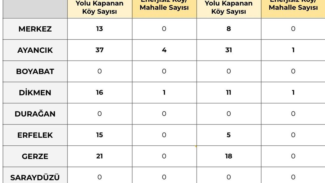 Sinop Valiliği’nden yapılan açıklamada, etkili olan kar yağışı sebebiyle, Merkez’de 8, Ayancık ilçesinde 31, Dikmen’de 11, Erfelek’te 5, Gerze’de 18, ve Türkeli’nde 4 köy yolu olmak üzere toplamda 77 köy yolunun ulaşıma kapalı olduğu bildirildi. Sinop İl Özel İdaresi ekipleri, kapalı köy yollarının tekrardan ulaşıma açılması için çalışmaların aralıksız sürdürüyor. Öte yandan, Ayancık ilçesinde 1, Dikmen ilçesinde 1 köye elektrik verilemediği belirtildi.