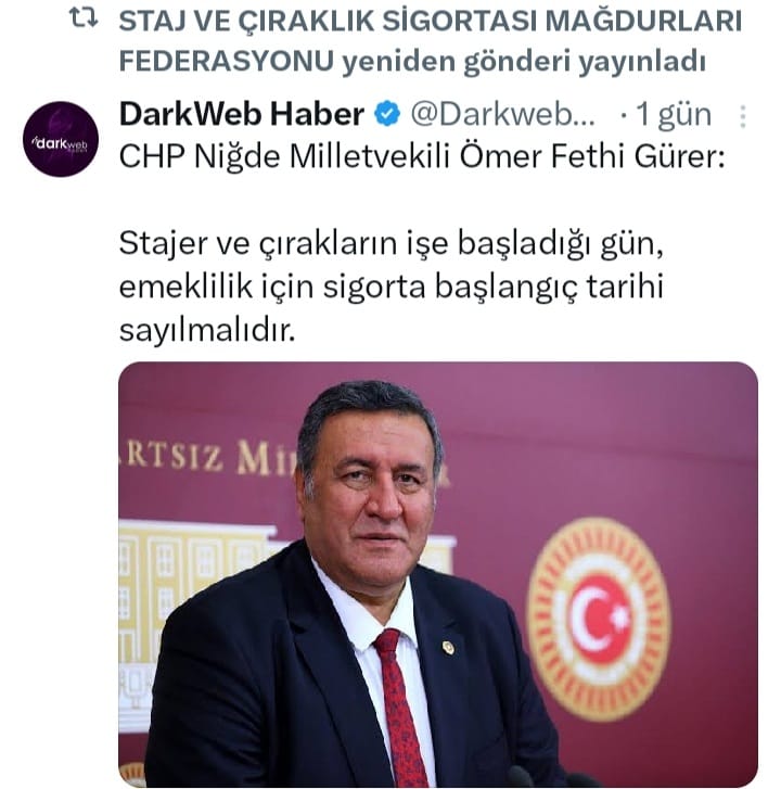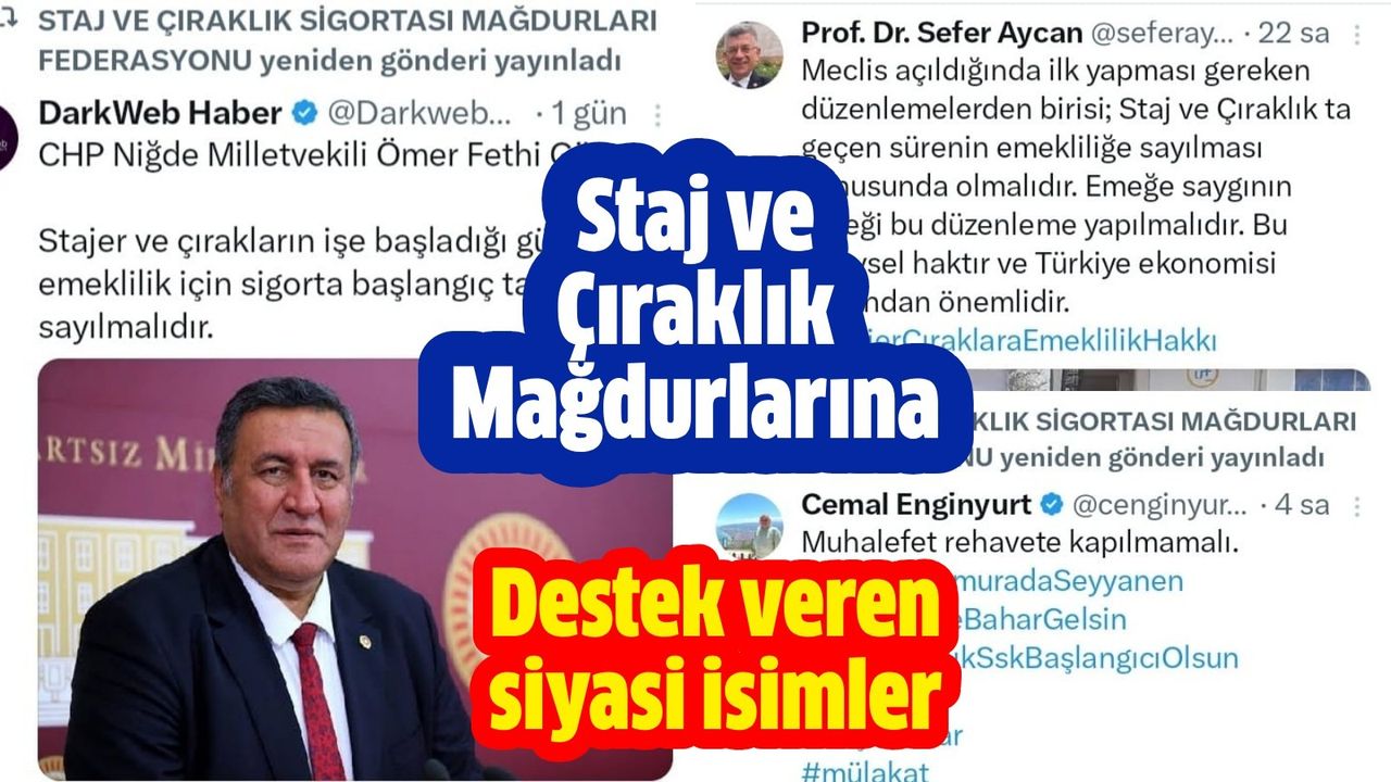 Staj ve çıraklık mağdurlarına destek veren bir diğer siyasi isim CHP Niğde Milletvekili Ömer Fethi Güner oldu. Güner, konuya ilişkin paylaşımında “stajyer ve çırakların işe başladığı gün, emeklilik için sigorta başlangıç tarihi sayılmalıdır.” İfadelerine yer verdi.