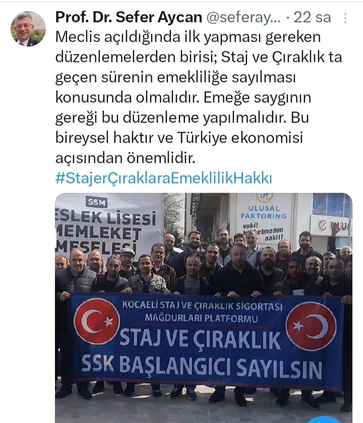 MHP Eski MYK Üyesi, Kahramanmaraş Milletvekili Prof. Dr. Sefer Aycan’ın hesabından da staj ve çıraklık mağdurlarına destek paylaşımı oldu. “Meclis açıldığında ilk yapılması gereken düzenlemelerden birisi staj ve çıraklıkta geçen sürenin emekliliğe sayılması konusunda olmalıdır. Emeğe saygının gereği bu düzenleme yapılmalıdır. Bu biresyel haktır. Türkiye ekonomisi açısından önemlidir.” İfadeleri kullanıldı.