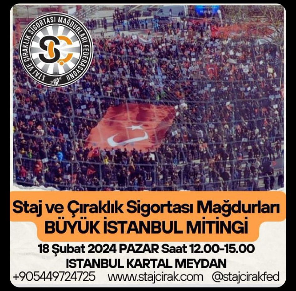 Staj ve Çıraklık Sigortası Mağdurları Federasyonu öncülüğünde İstanbul ve Ankara’da gerçekleşen büyük buluşmaların ardından yeniden İstanbul’da toplanacak olmanın heyecanı yaşanıyor. 18 Şubat Pazar günü saat 12.00 ile 15.00 arasında Kartal’da yapılacak büyük İstanbul Mitingi için çağrıda bulunan Federasyon ve illerdeki dernek başkanları başta siyasiler olmak üzere toplumun her kesimini çözümün tarafı olmaya davet ediyorlar.