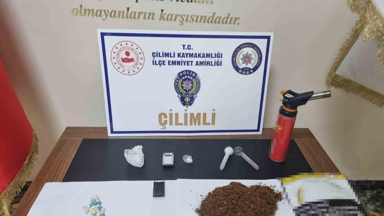 Çilimli İlçe Emniyet Müdürlüğü ekipleri yaptıkları çalışmalarda durumundan şüphelendikleri bir aracı durdurdular. Durdurulan araç içerinde yapılan aramada 27 adet ekstacy (sentetik ecza), 10.28 gram netamfetamin, 42 gram A/M, 2 adet cam payp, 1 adet anahtarlık görünümlü hassas terazi, 1 adet muşta ve 106 garm üzerine A/M sıkılmış kanobonoid maddesi ele geçirildi.