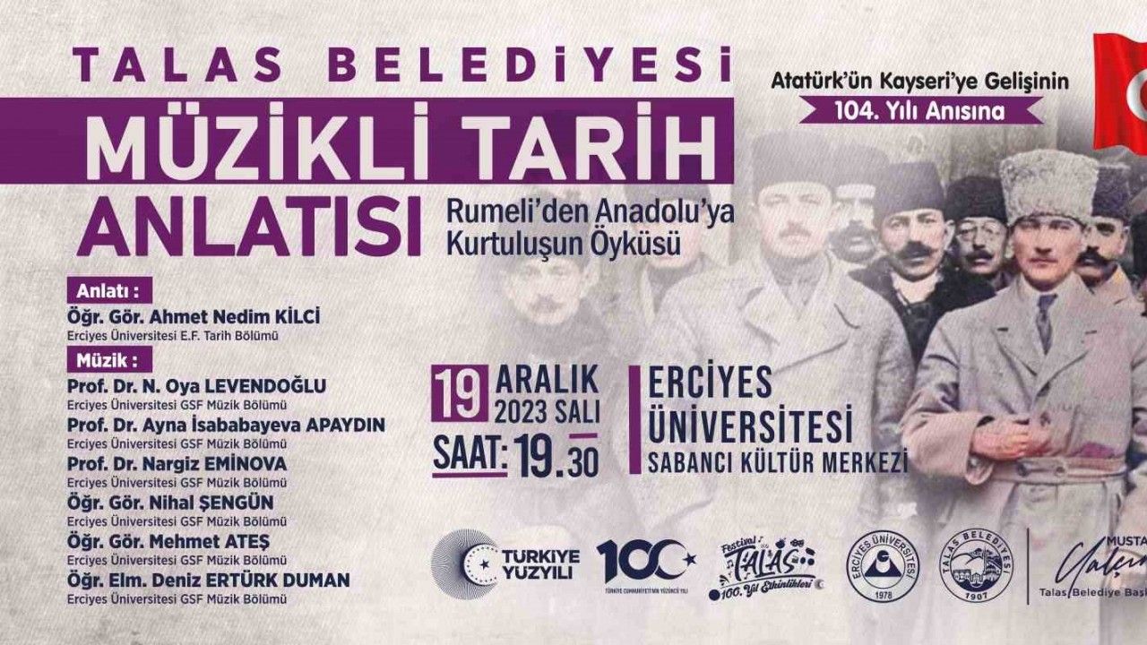 ‘Festival Talas 100. Yıl Etkinlikleri’ kapsamında düzenlenecek ‘Müzikli Tarih Anlatısı’nda Balkan Savaşlarından başlayıp Milli Mücadele ve Cumhuriyetin ilanına kadar geçen süre anlatılacak. Erciyes Üniversitesi(ERÜ) Öğretim Görevlisi Ahmet Nedim Kilci’nin anlatımıyla gerçekleşecek programda Güzel Sanatlar Fakültesi Dekanı Prof. Dr. N. Oya Levendoğlu’nun yanı sıra öğretim üyeleri Prof. Dr. Ayna İsababayeva Apaydın, Prof. Dr. Nergis Eminova, Öğr. Gör. Nihal Şengün, Öğr. Gör. Mehmet Ateş ve Öğr. Elm Deniz Ertürk Duman sahne alacak.