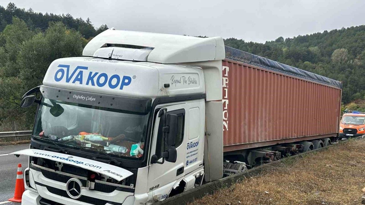 TEM Otoyolu’nun Bolu geçişinde sürücüsünün direksiyon hakimiyetini kaybettiği tır beton bariyerlere çarptı. Çarpmanın etkisiyle meydana gelen kazada tır şoförü yaralandı.